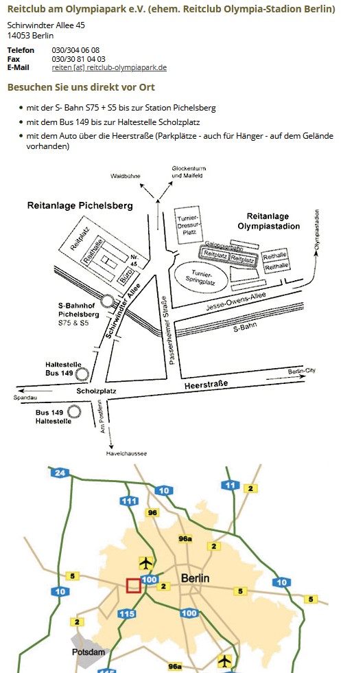 Die Reitanlagen Pichelsberg und Olympiastadion gehören zum Olympiapark Berlin, in dem sich auch das unter Denkmalschutz stehende Reiterstadion befindet.